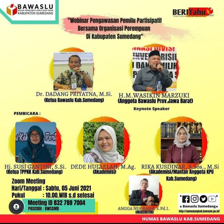 Bawaslu Kabupaten Sumedang telah melaksanakan kegiatan “Webinar Pengawasan Pemilu Partisipatif Bersama Organisasi Perempuan di Kabupaten Sumedang”. Acara ini dilaksanakan dalam