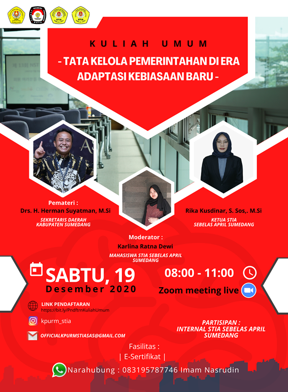 Salam Mahasiswa! Komisi Pemilihan Umum Raya Mahasiswa STIA Sebelas April Sumedang mempersembahkan Kuliah Umum dengan tema “TATA KELOLA PEMERINTAHAN DI